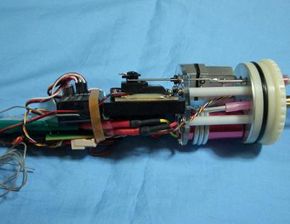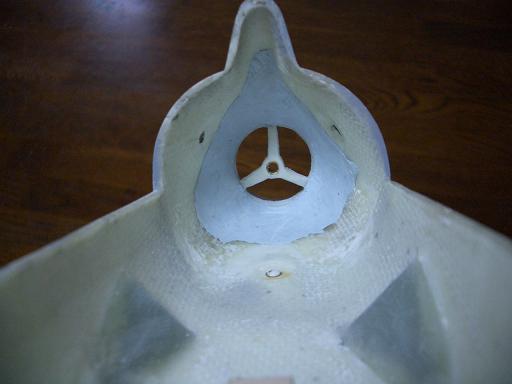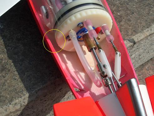 「アクアレーサーT」には船体中央下方に大きなインテークが有ります。ここから吸入された水は胴体の中を流れ噴射口に導かれますが中には大きなWTCが有って水の流れを邪魔します。特に黄○マークの部分が狭くなってるのに気がつきました。 |