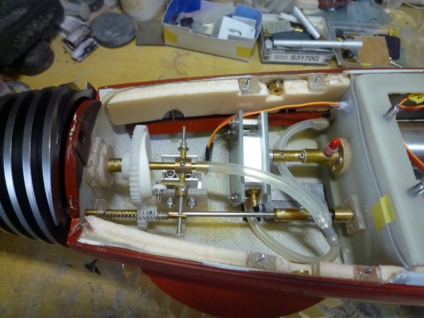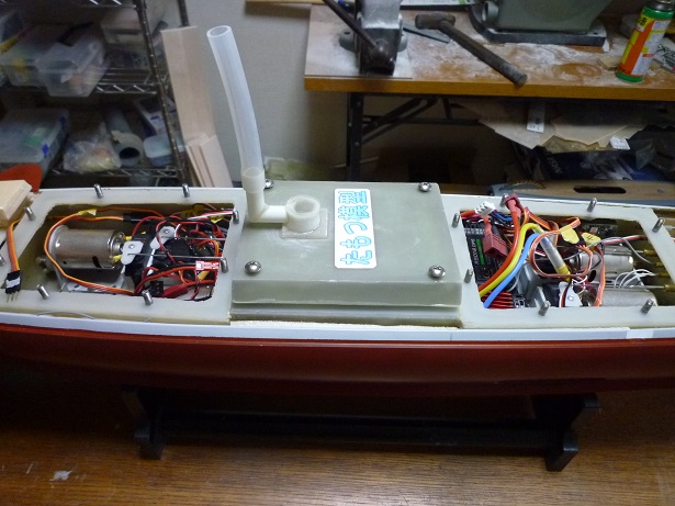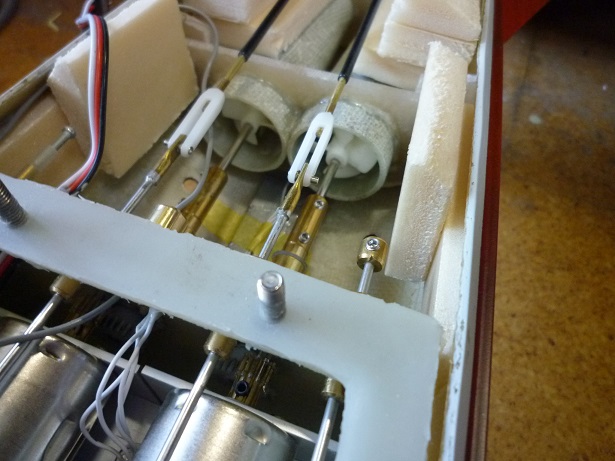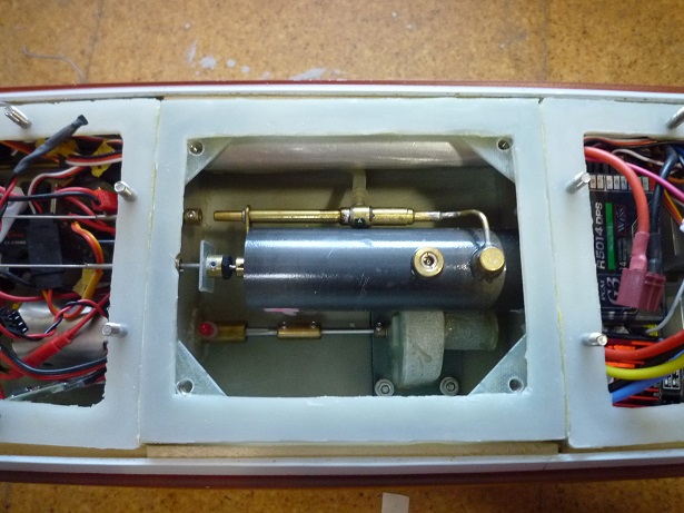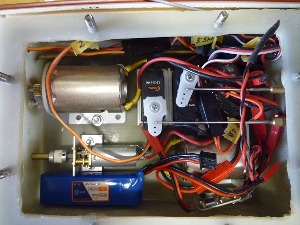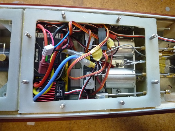 後部メカ室 駆動用モーター二基 サーボ、スピコン、バッテリーなど配置 |